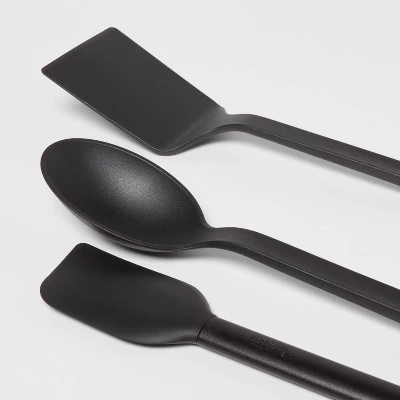 Bring convenience to your cooking chores with this 3-Piece Nylon Kitchen Utensil Set from Room Essentials™. This set includes a turner, a spatula and a spoon, each made from nylon in a solid hue to coordinate with your other kitchen tools. Each small kitchen tool in this set features a long handle with an integrated hole for easy hanging from any hook in your kitchen, while the dishwasher-safe design makes cleanup a breeze.